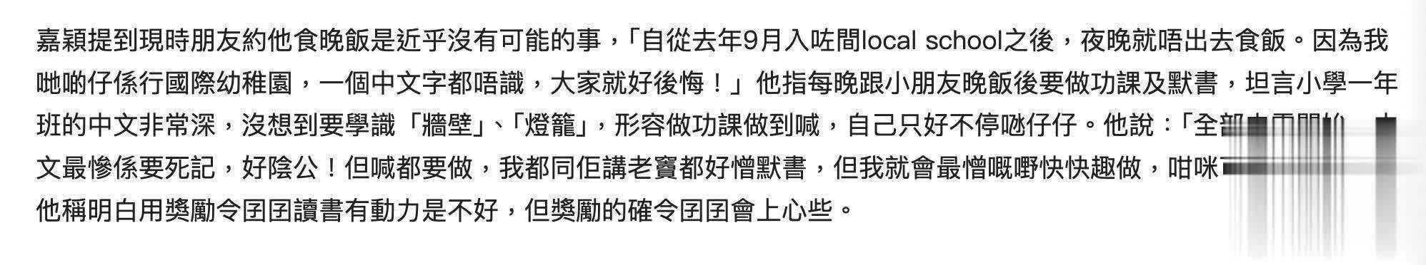 郑嘉颖回忆说,自从长子进入传统小学后,他的晚餐时间几乎全都留给了陪读。每天晚上,朋友们都不敢邀他外出聚餐,因为他要陪着儿子做功课,忙得不可开交。每天,他都要辅导儿子背书、默写,甚至有时感觉苦不堪言。他无奈地笑道,儿子在上小学之前连一个中文字都不会,因为他之前就读的是国际幼儿园,而国际幼儿园根本不教中文。如今,儿子直接进入传统小学,面对复杂的中文,压力可想而知。尽管儿子做功课时常会哭泣,但他明白,这一切都必须坚持下去。作为父亲,郑嘉颖只能继续做那个陪伴在一旁的陪读爸爸,夜夜为儿子加油打气。