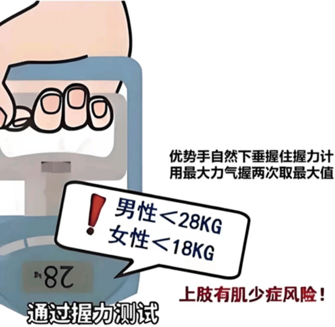 肌肉力量下降:握力减弱(男性<28kg,女性<18kg)