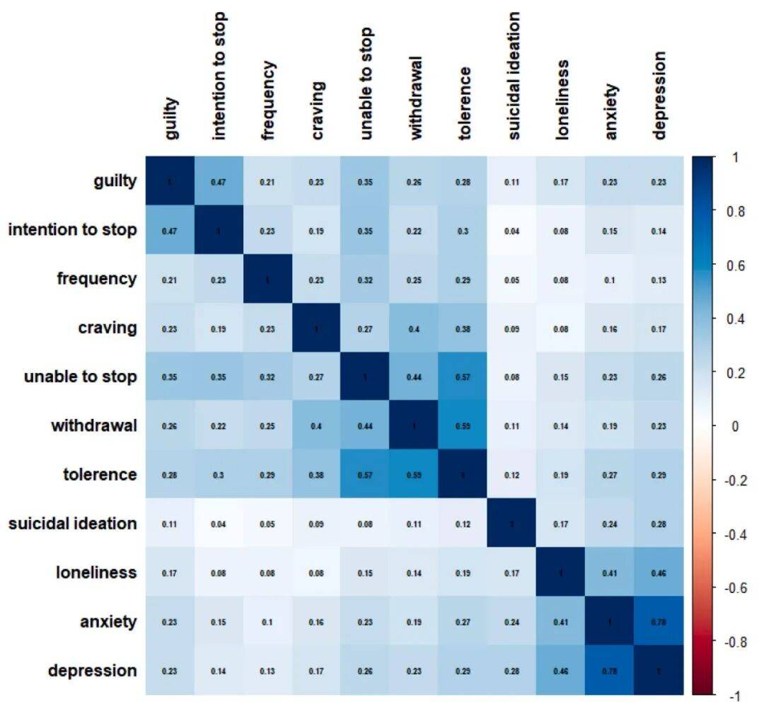明确地说,孤独感与奶茶成瘾之间存在正相关关系,这意味着,个体在感受到更多孤独时,更容易沉迷于奶茶。此外,奶茶成瘾与抑郁症状和焦虑症状也显示出中度的正相关关系。