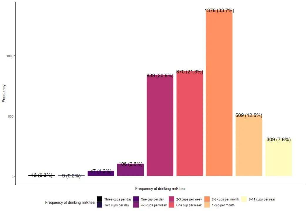 几乎一半的受访者表示,他们每周至少喝一杯奶茶。其中,2.6% 的青少年每周喝 4 至 6 杯奶茶,20.6% 的青少年每周喝 2 至 3 杯奶茶。