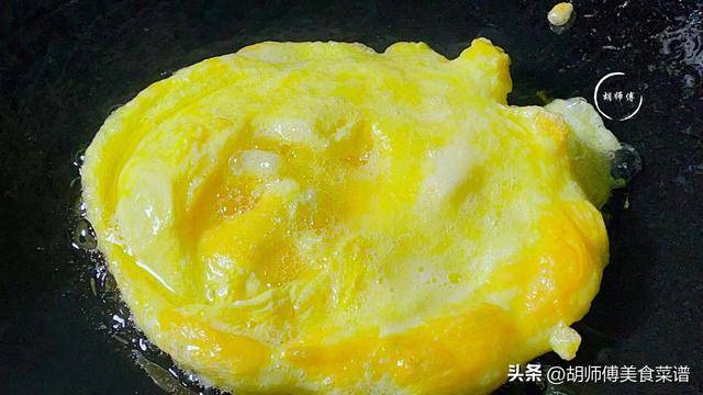 第二步:锅中放入适量油,等油烧热后,把蛋液倒入锅中,大火将鸡蛋两面都煎成浅黄色。