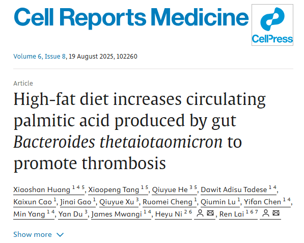 [1] Xiaoshan Huang, Xiaopeng T, Qiuyue He, et al. High-fat diet increases circulating palmitic acid produced by gut Bacteroides thetaiotaomicron to promote thrombosis, Cell Reports Medicine, Volume 6, Issue 8, 2025, 102260, ISSN 2666-3791.do:10.1016/j.xcrm.2025.102260
