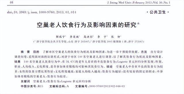 [1]解瑞宁,李英娥,高洪彩,等.空巢老人饮食行为及影响因素的研究[J].济宁医学院学报,2013,36(01):46-48.