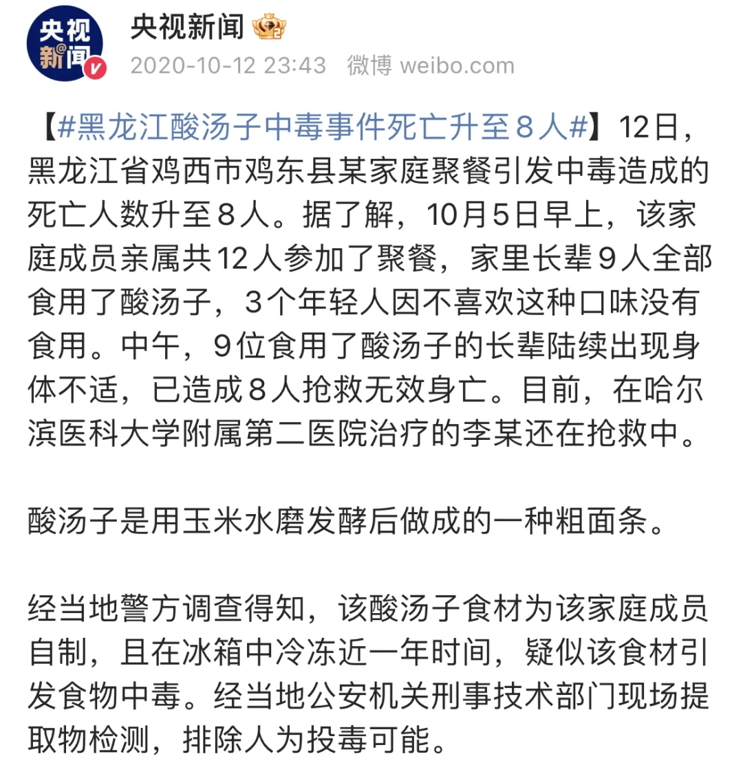 之前黑龙江酸汤子中毒事件(导致9人死亡)的元凶初步认定就是它。
