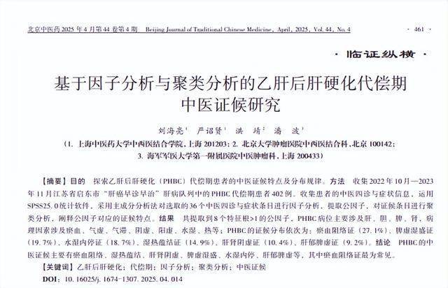 基于因子分析与聚类分析的乙肝后肝硬化代偿期中医证候研究 刘海亮;严诏贤;洪靖;潘波,北京中医药 2025-04-25
