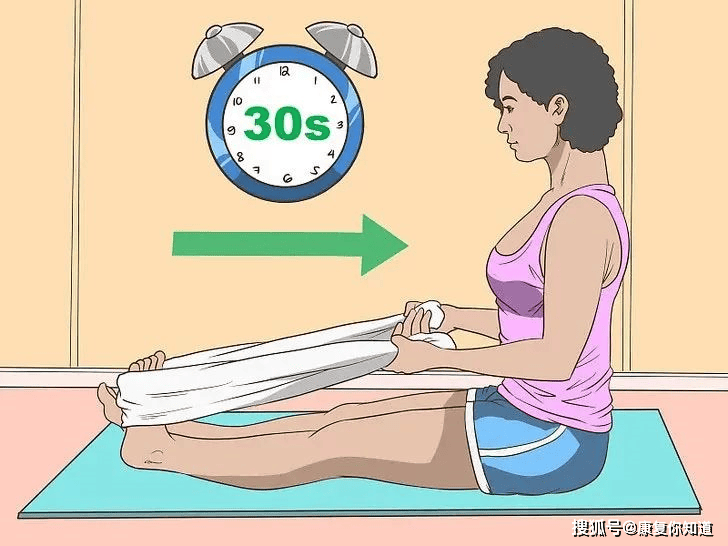 用毛巾套住前脚掌,然后慢慢用毛巾把脚掌拉向身体,同时保持腿伸直,保持15~30秒。