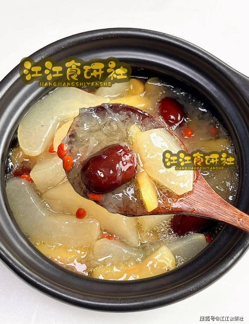 银耳和冷水一起下锅,大火煮开后,立刻用勺子快速搅拌15秒。这个动作能帮助银耳快速出胶。