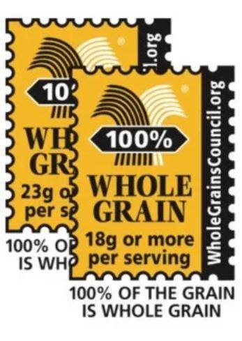 邮票中包含基本标志,表示包含了大量全谷物但主要包含精致谷物的产品,每份全谷物最低含量为8克。