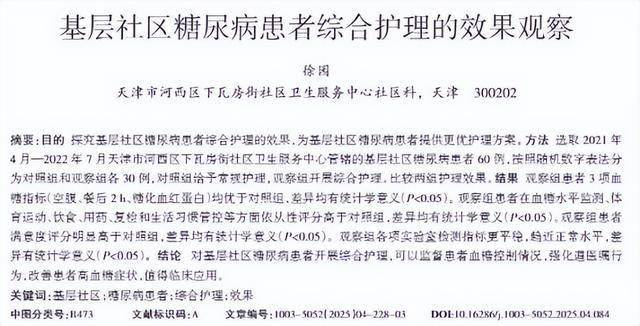 徐园.基层社区糖尿病患者综合护理的效果观察[J].中国城乡企业卫生,2025,40(04):228-230.