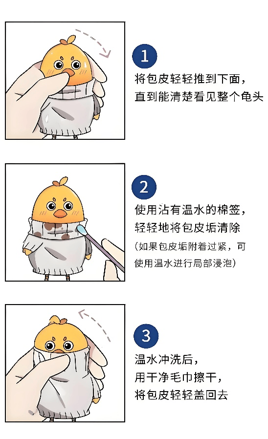 每日“大扫除”是基础!轻柔翻起包皮,温水彻底清洗丁丁头及冠状沟,擦干后复位! (重要!)