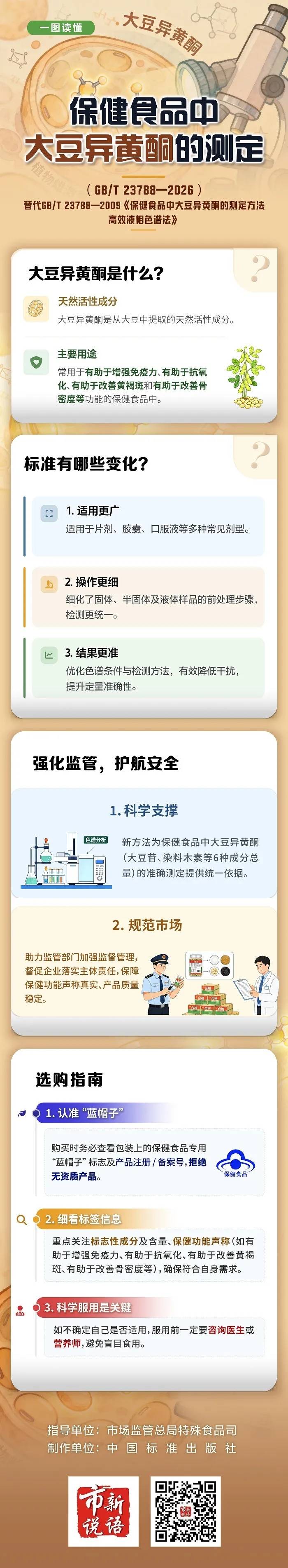 新标准在适用范围、样品处理、色谱条件等关键技术环节进行了精细化调整,旨在为行业监管提供更为精准、高效的技术支持,将有助于保障市场上大豆异黄酮类保健食品的质量安全。