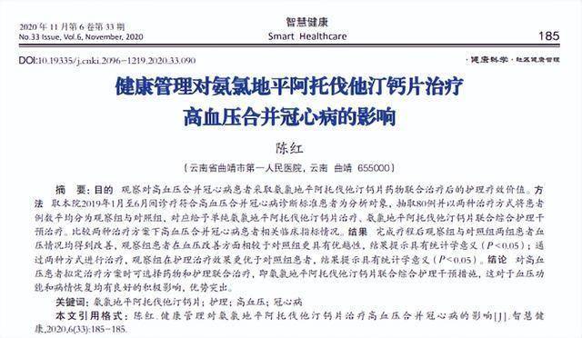 健康管理对氨氯地平阿托伐他汀钙片治疗高血压合并冠心病的影响,陈红,智慧健康,2020-11-25