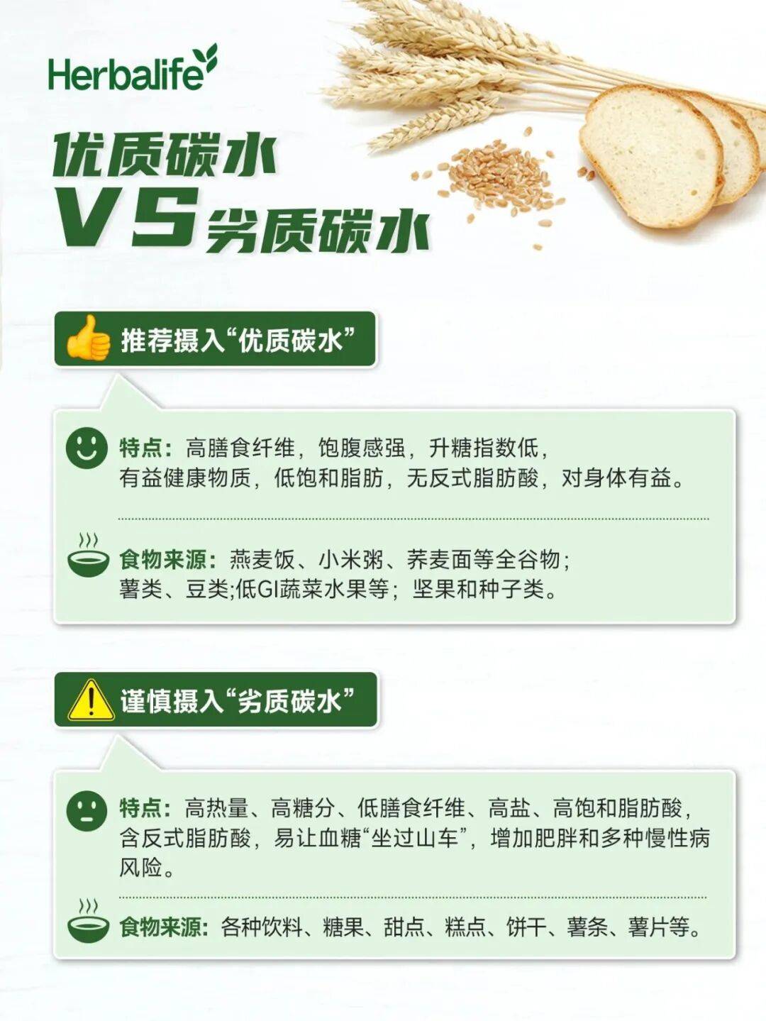 除了优质和劣质,碳水化合物还可以按照"消化速度"分为快碳和慢碳。一个简单的建议是:一餐中尽量让慢碳的比例高一些。比如把白米饭换成糙米或杂粮饭,把白面包换成全麦面包,把土豆换成红薯。
