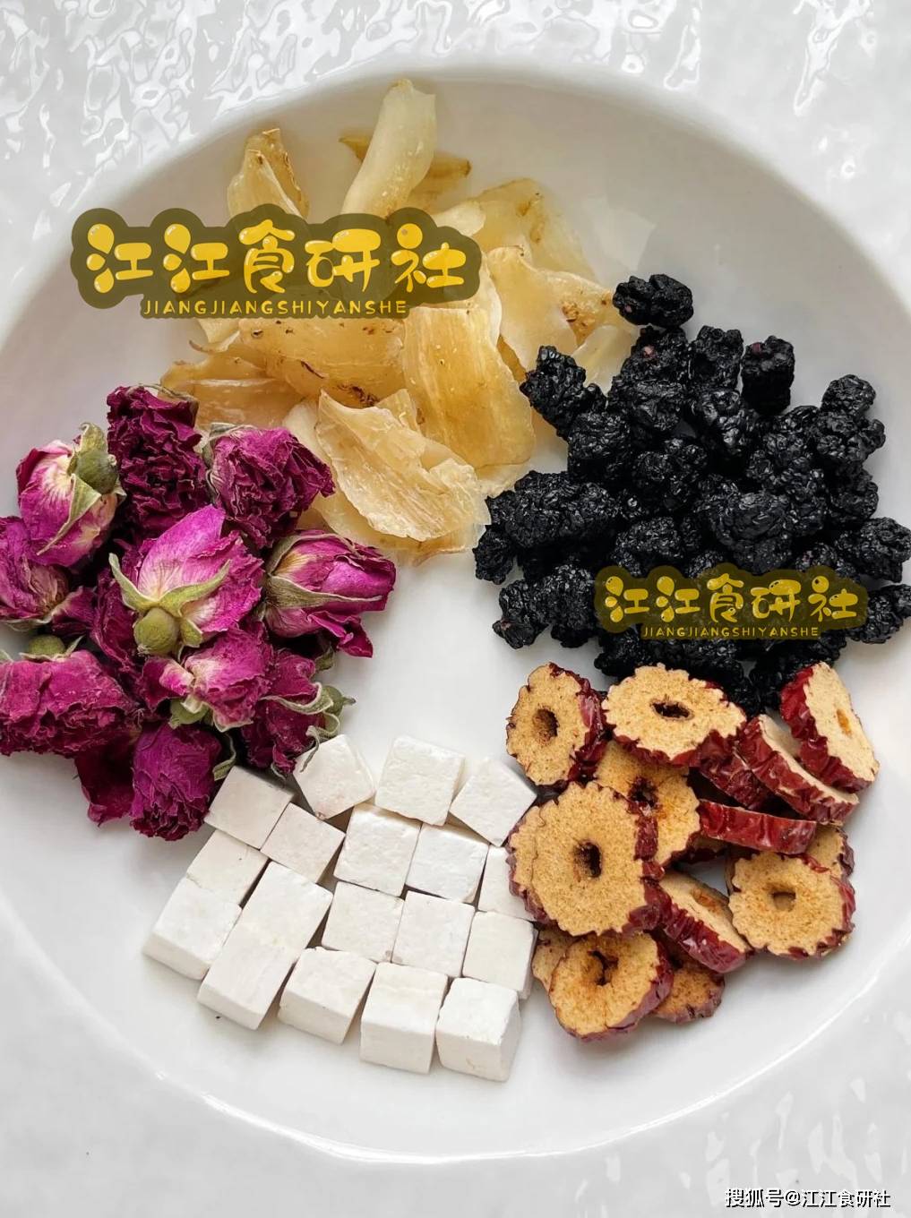 玫瑰的选择。 一定要用可食用的干玫瑰花冠,花苞紧实,颜色紫红。那种颜色过于鲜艳的,可能熏过硫,闻起来有刺鼻酸味,不要用。