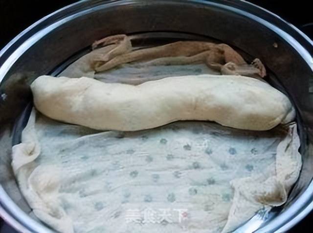 4. 烧锅开水,将制作好的肉龙放进蒸锅中大火蒸上15分钟将其蒸熟,焖上2分钟再揭开盖, 吃时切成小段即可。