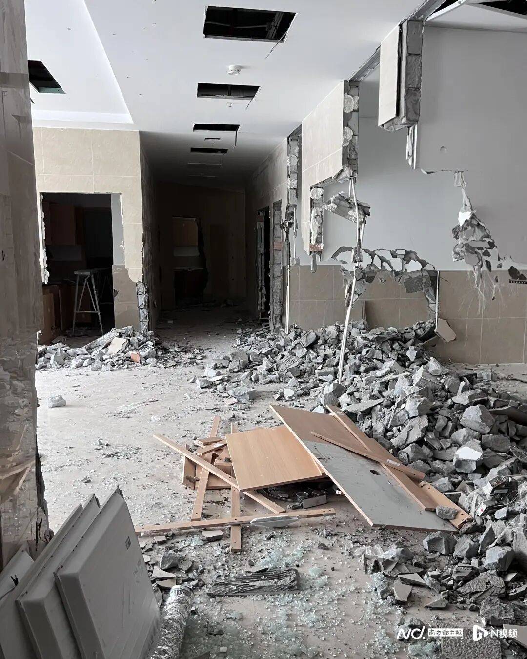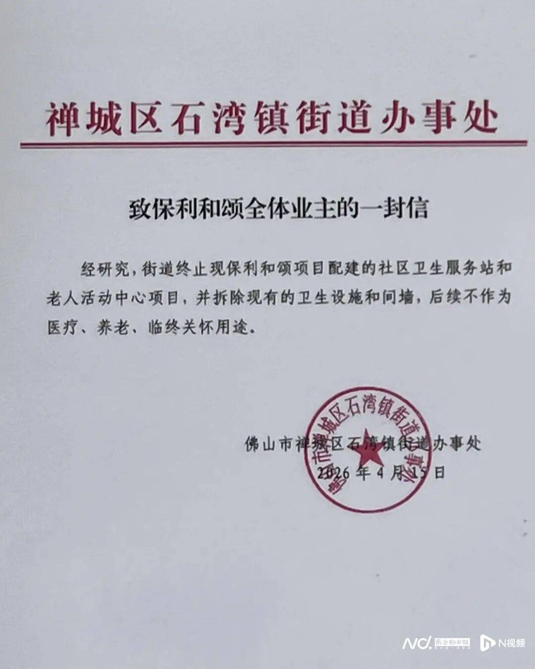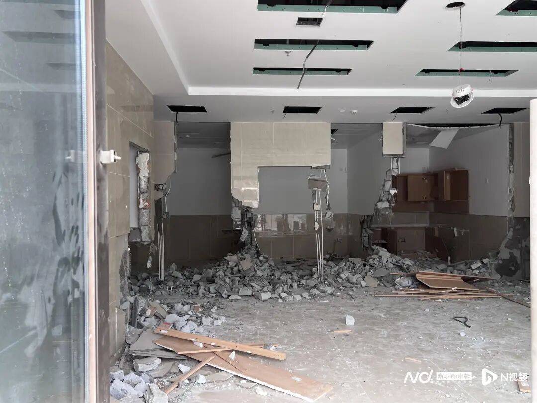 4月16日,南都N视频记者实地走访了该小区,看见上述疑似建设“临终关怀病房”的建筑位于小区东门一侧连片商铺处,整体呈现L形。建筑外表为反光玻璃,走近才可看清内部情况,上贴有佛山市禅城区石湾镇街道的红头文件,称经研究,街道终止现保利和颂项目配建的社区卫生服务站和老人活动中心项目,并拆除现有的卫生设施和间墙,后续不作为医疗、养老、临终关怀用途。建筑内,拆除工作已开始,地上满是砖瓦和玻璃碎片。