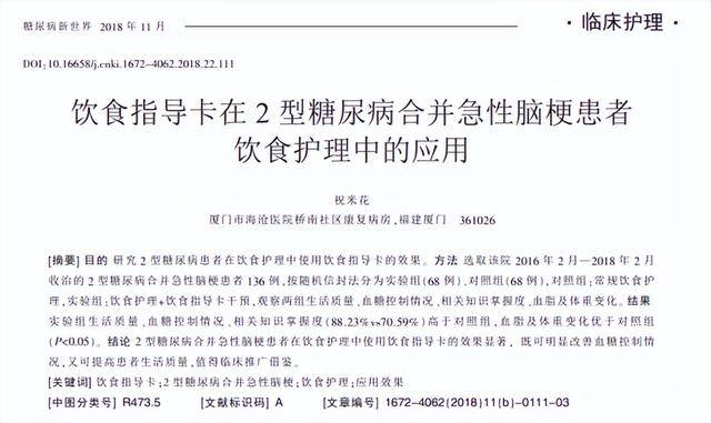 [1]祝米花.饮食指导卡在2型糖尿病合并急性脑梗患者饮食护理中的应用[J].糖尿病新世界,2018