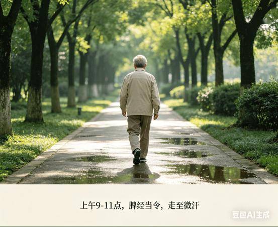 这是脾经最旺的时候,快走或慢走,走到身上微微出汗就行。别出大汗,会耗气;也别不出汗,没效果。出汗后马上擦干,别让湿气再钻回去。