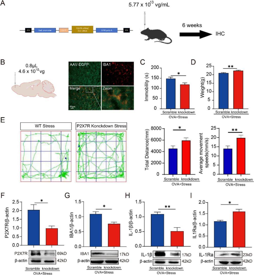 研究通过在小鼠嗅球中特异性敲低小胶质细胞的P2X7受体,进一步验证了其在“过敏性鼻炎+应激”诱发抑郁中的关键作用。
