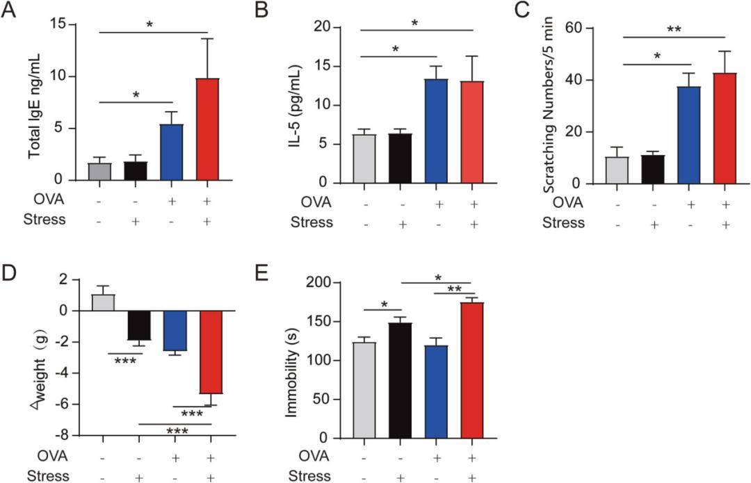研究成功建立了过敏性鼻炎小鼠模型:卵清蛋白(OVA)致敏后,小鼠血清总IgE和IL-5水平升高,抓鼻频率增加,符合过敏特征。单独应激或单独OVA均未显著改变这些过敏指标。