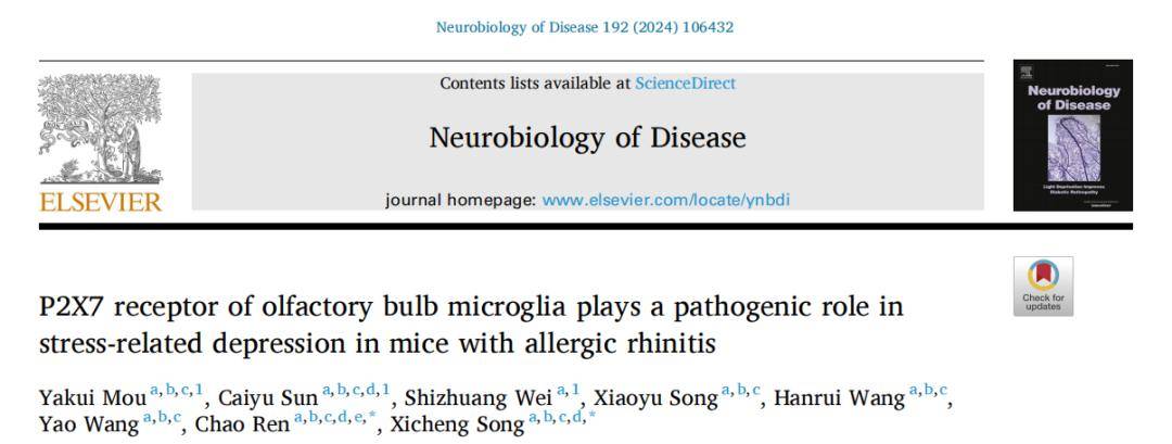 基于此,青岛大学附属烟台毓璜顶医院 宋西成、任超研究团队在 《Neurobiology of Disease》杂志发表了“ P2X7 receptor of olfactory bulb microglia plays a pathogenic role in stress-related depression in mice with allergic rhinitis”揭示了过敏性鼻炎小鼠嗅球小胶质细胞P2X7受体在应激相关抑郁中发挥致病作用。