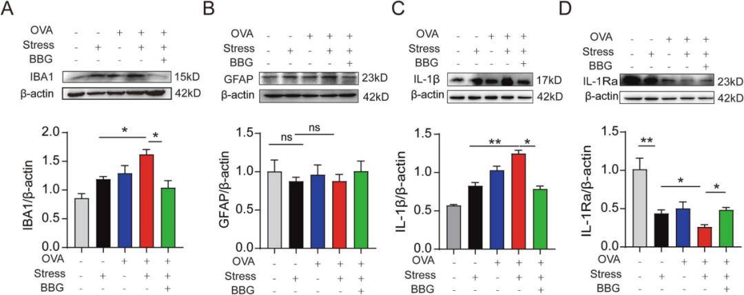 嗅球中活化的小胶质细胞(Iba1)和促炎因子IL-1β显著降低,而抗炎因子IL-1Ra升高,神经炎症得到抑制。