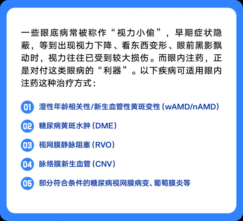 它是从角膜缘后3.5-4毫米处进针,将药物精准注射到眼球内部,主要针对多类眼底病变。通过直接给药,让药物在病变部位达到必要的浓度,从而解决静脉注射等方式药物在眼部浓度不足的问题,保障治疗效果。
