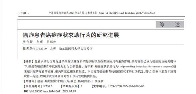 [1]张佳媛 刘丽 周郁秋.癌症患者癌症症状求助行为的研究进展,中国癌症防治杂志,2024-6