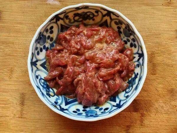 1.首先准备20块钱的牛肉,逆着纹路给它切成厚厚的薄片。往里面加入一个鸡蛋清、生抽、精盐食用油调味。用手给它抓拌均匀,腌制五分钟备用。用这个方法腌制好的牛肉不腥不柴,滑嫩又爽滑。
